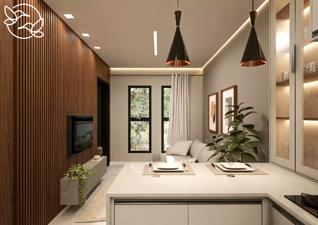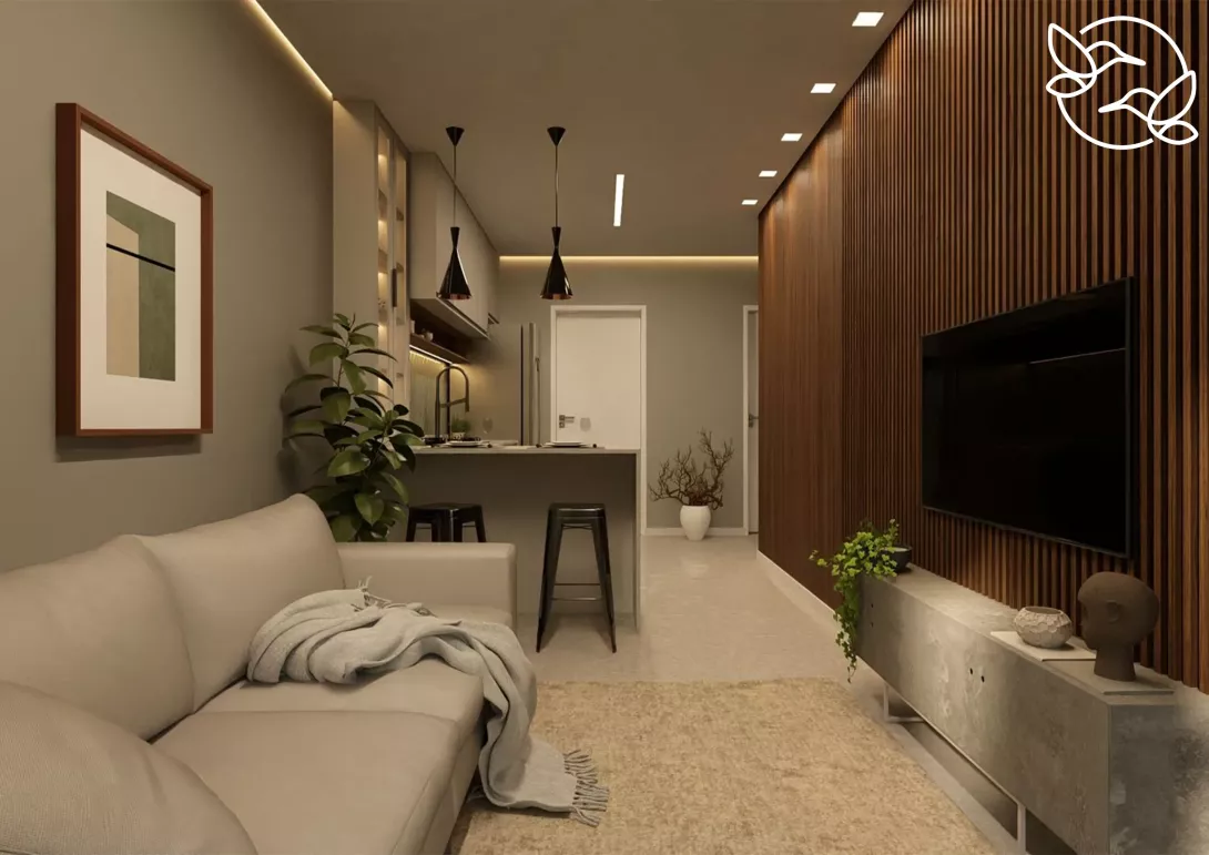 - Ambientes integrados de sala e cozinha – mais amplitude e aconchego